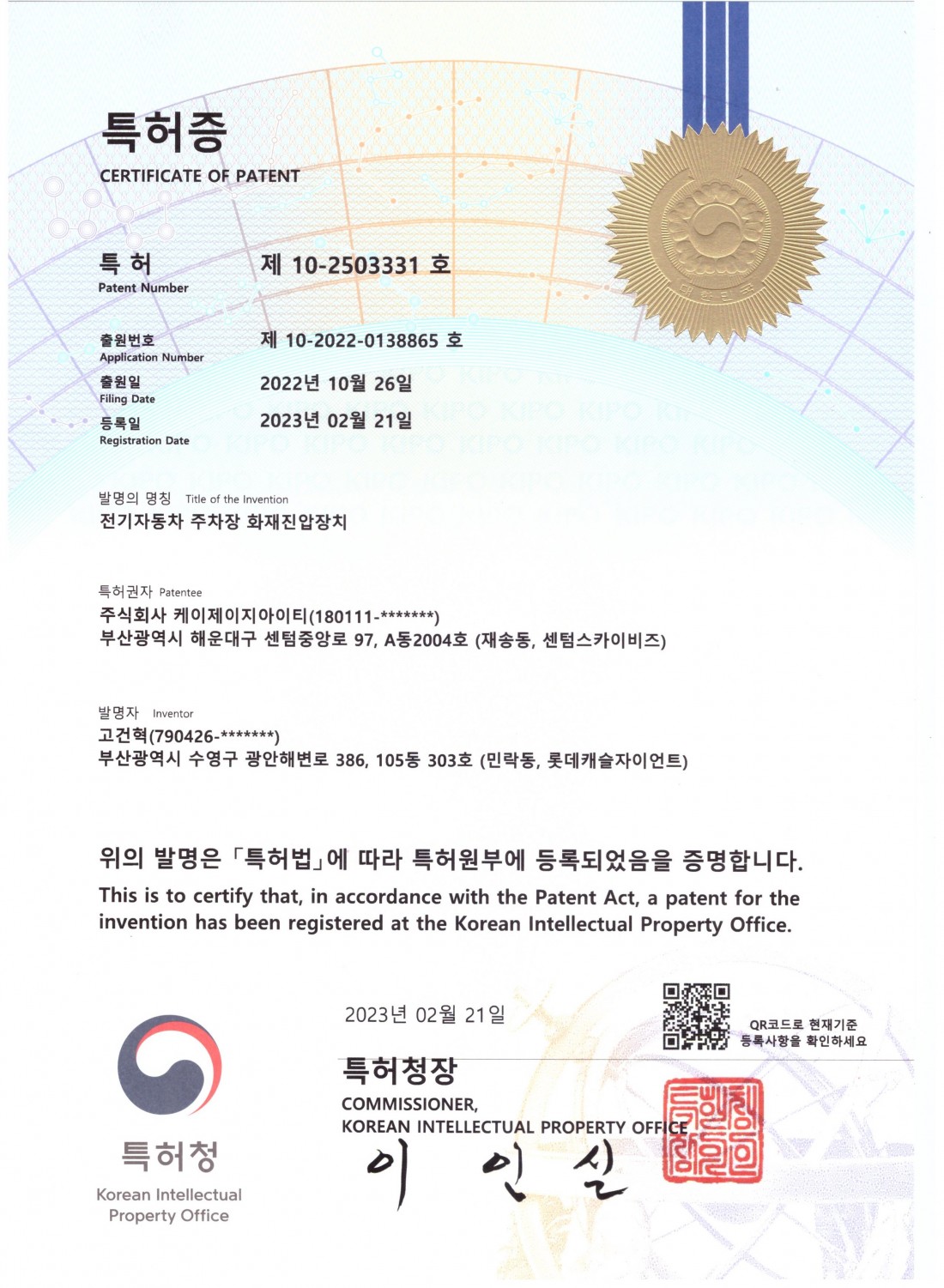 - 이전글특허증 - 전기자동차 화재 진압용 절첩식 배터리 침수조 23.08.24
