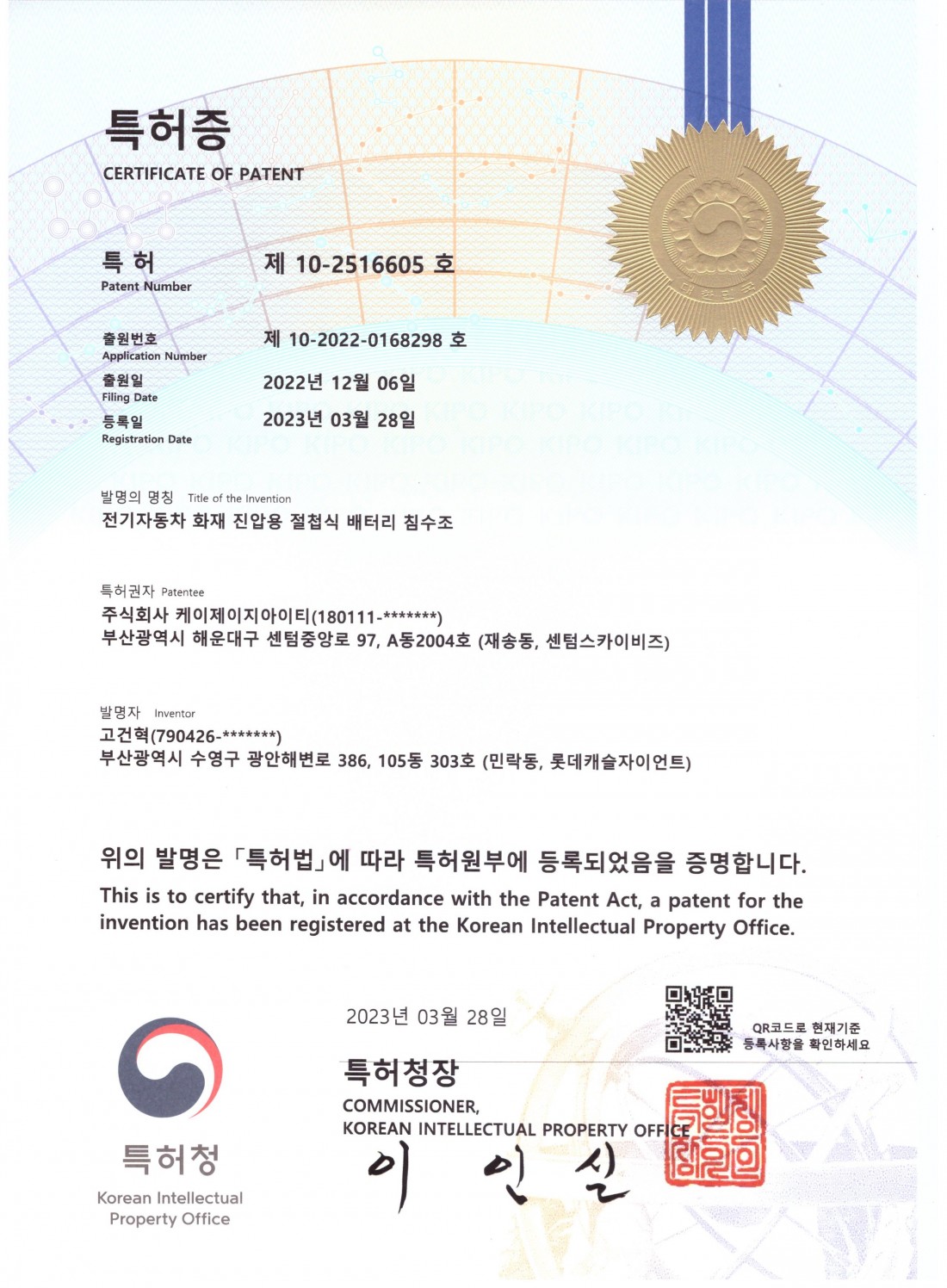 - 다음글특허증 - 전기자동차 주차장 화재진압장치 23.08.24